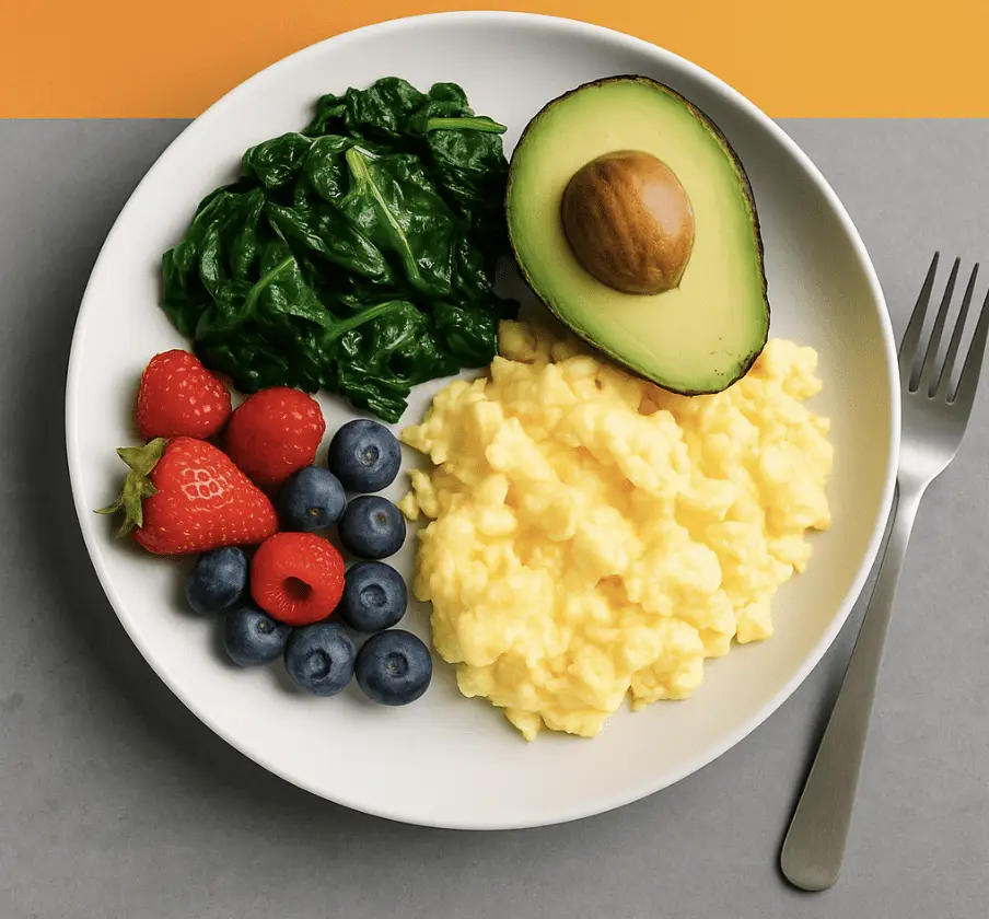 Breakfast: 3 scrambled eggs with sautéed spinach, half an avocado, and a cup of mixed berries (approximately 25g protein)